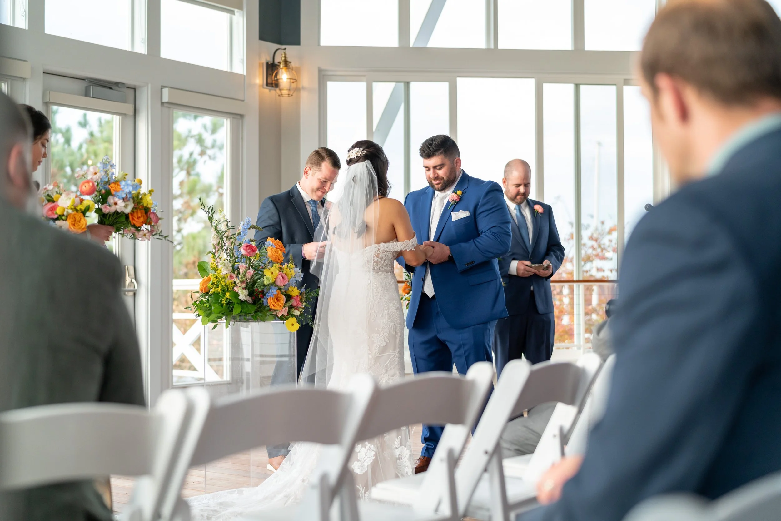 Venue and catering: Chesapeake Bay Beach Club | Photography: Jessica Nazarova Photography | 2nd Photographer: Suzanne Jakes | Flowers: Florals by Heidi Catherine via Poppy Flowers | Gown: John Charles from J Bridal Boutique in Tucson AZ | Rings: Contreras House Fine Art